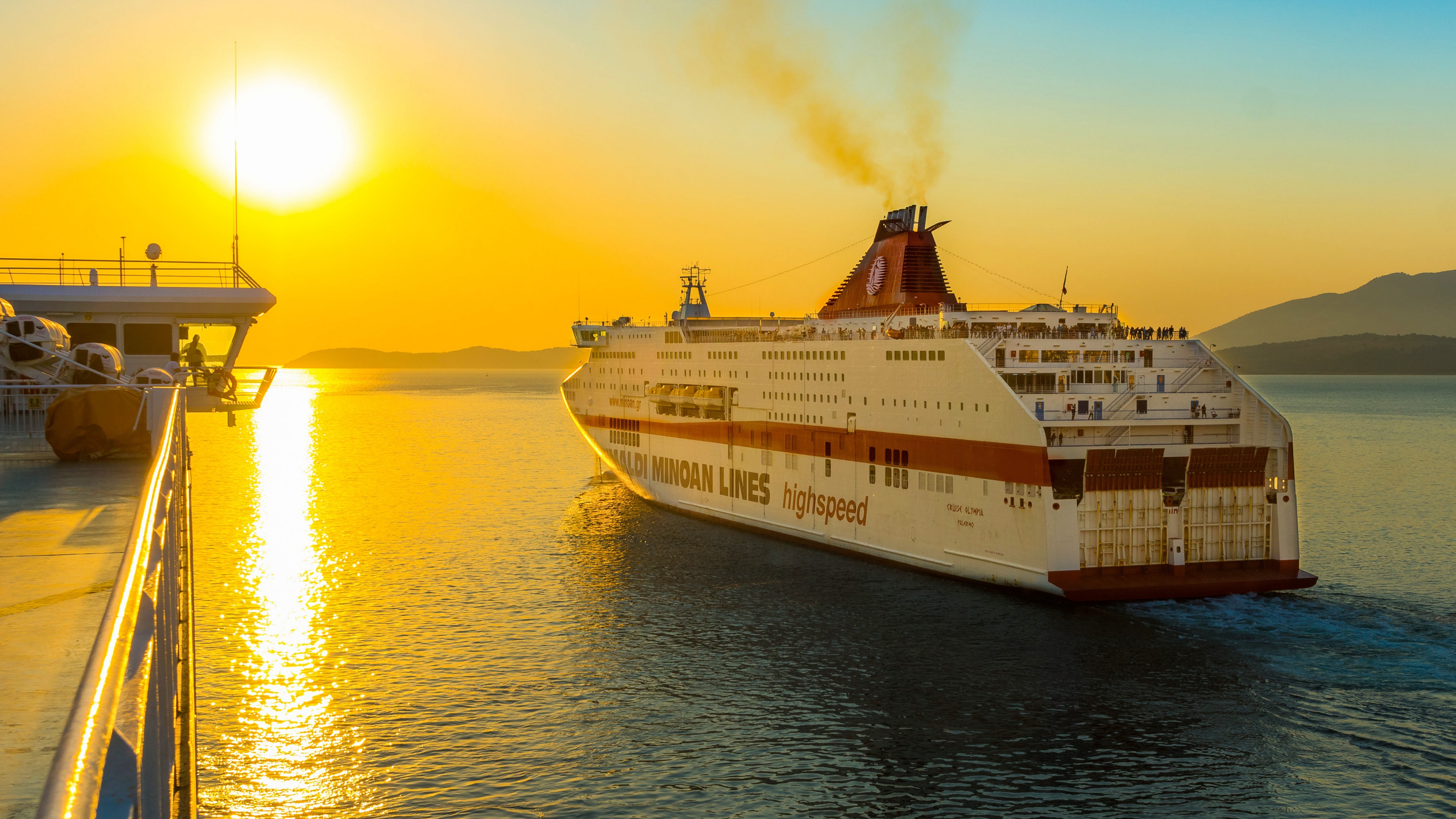 Description: A large cruise ship in the water at sunset with a mountain in the background and a boat in the water.