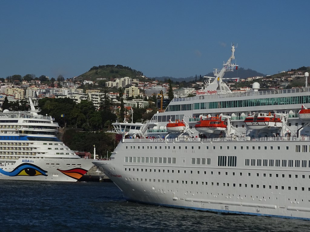 Description: Two cruise ships are docked in the water near a city and a hill in the background with a city in the distance.