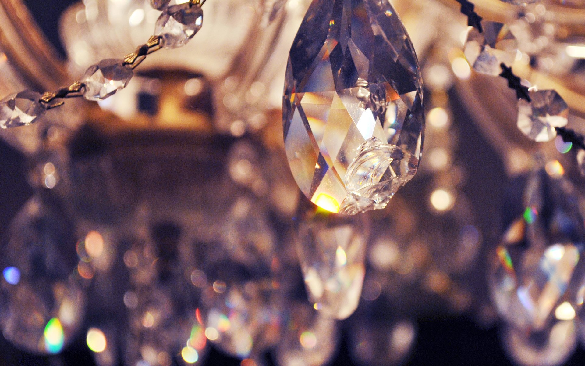 Description: A chandelier with a lot of crystal drops hanging from it's sides and a chandelier in the background.