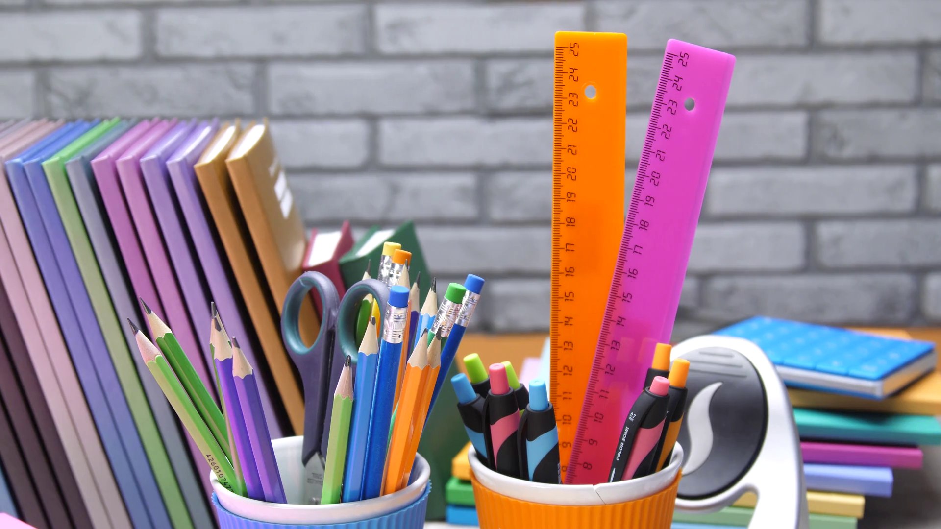 Description: A cup filled with pencils and markers next to a ruler and a cup of pens and pencils.