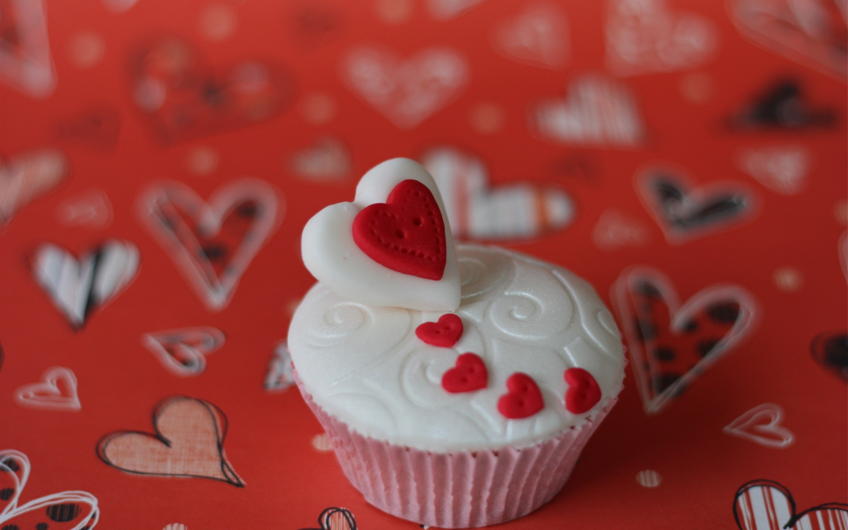 Description: A cupcake with a heart on top of it on a red tablecloth with hearts and hearts around it.