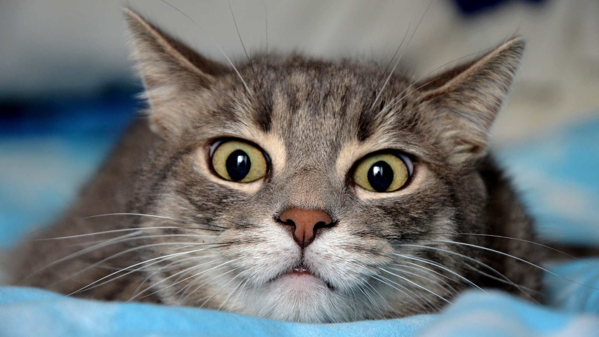 Description: A cat with a surprised look on its face laying on a blanket looking at the camera with a curious look on its face.
