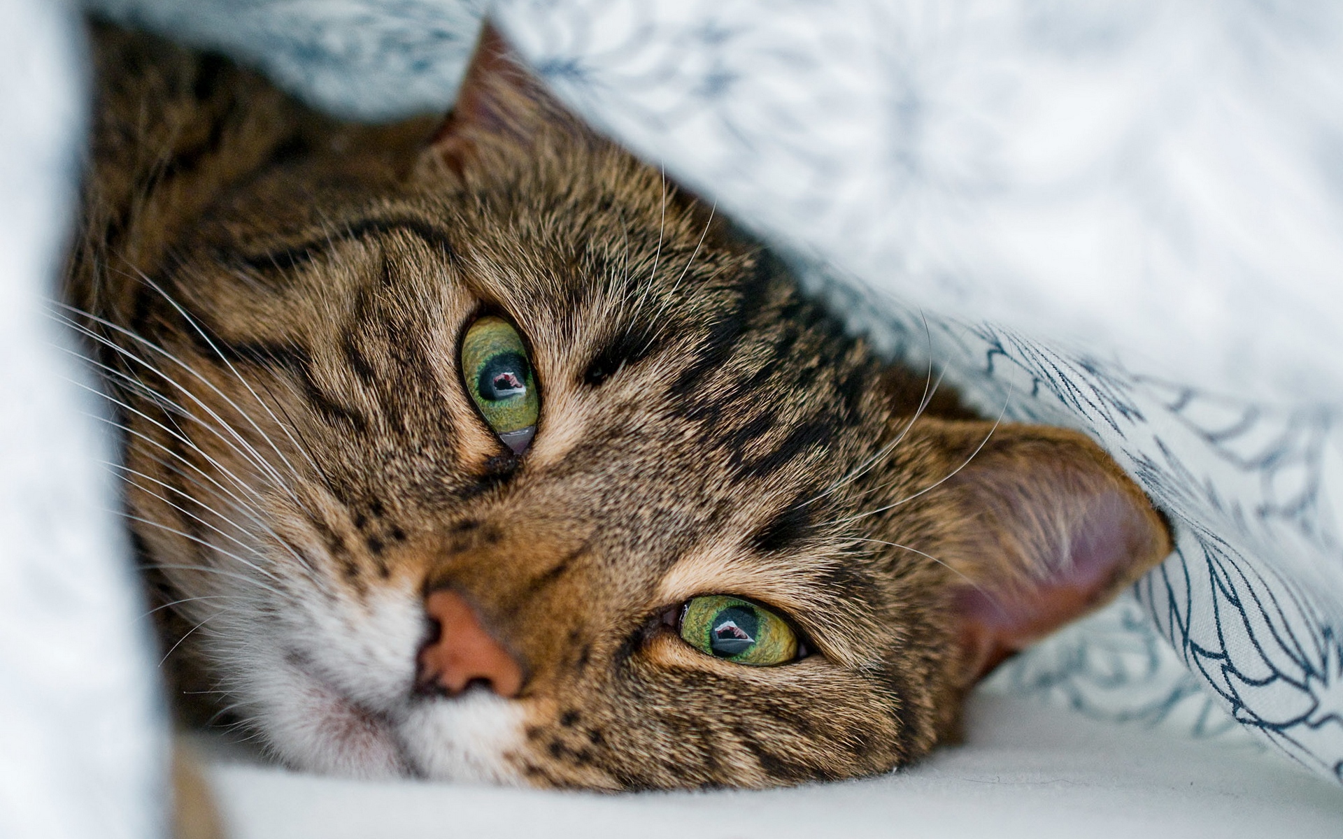 Description: A cat is laying under a blanket on the bed looking at the camera with a curious look on its face.