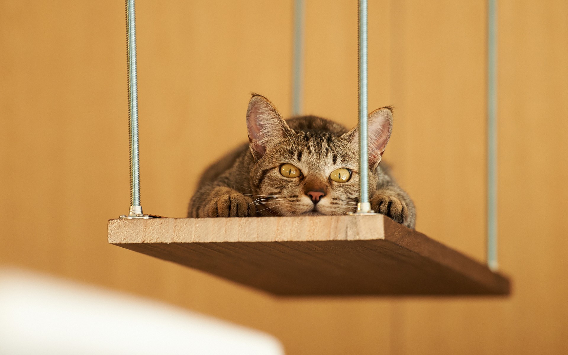 Description: A cat is sitting on a wooden shelf and looking at the camera with a curious look on its face.