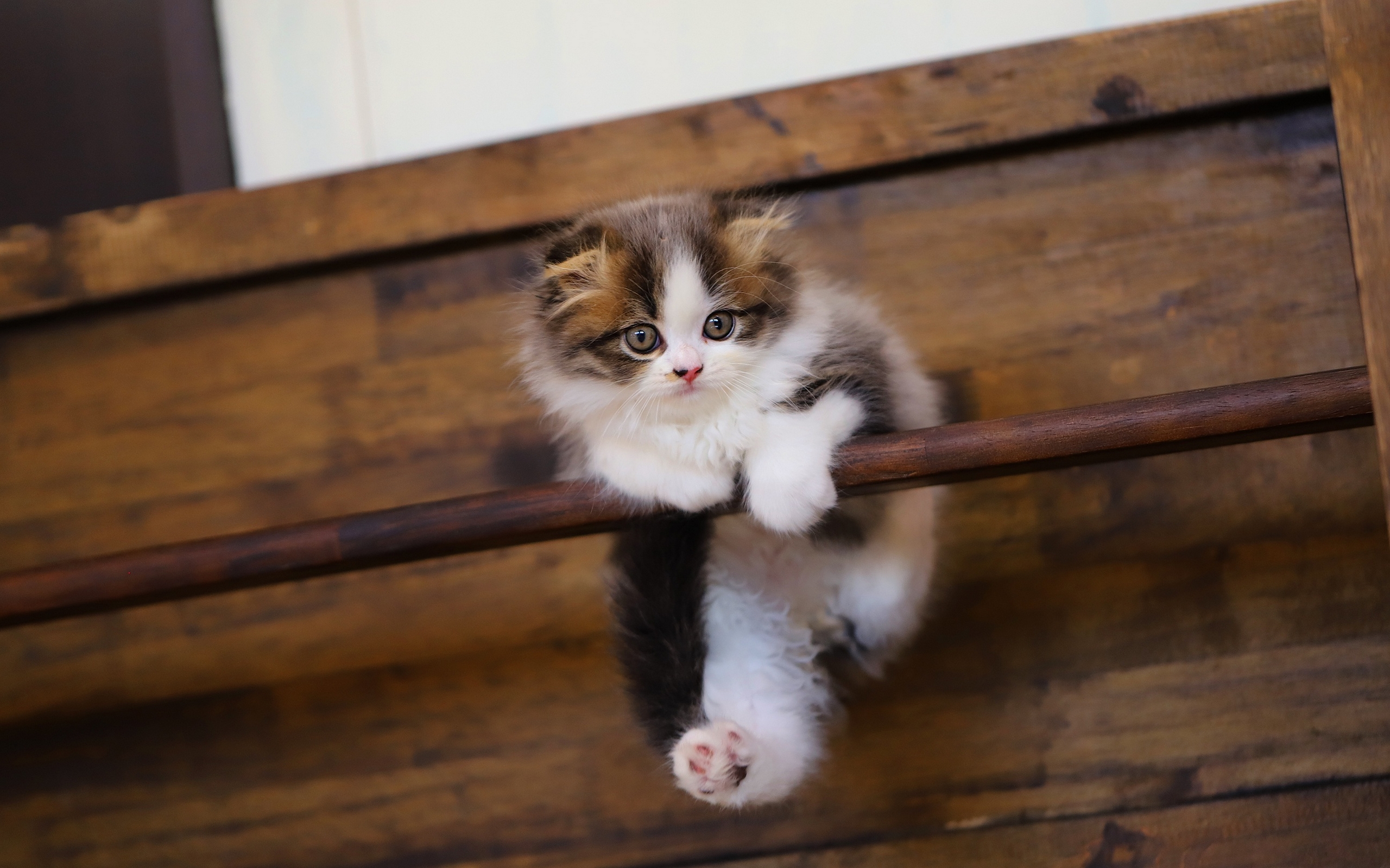 Description: A kitten is climbing up a wooden rail and looking at the camera with a curious look on its face.