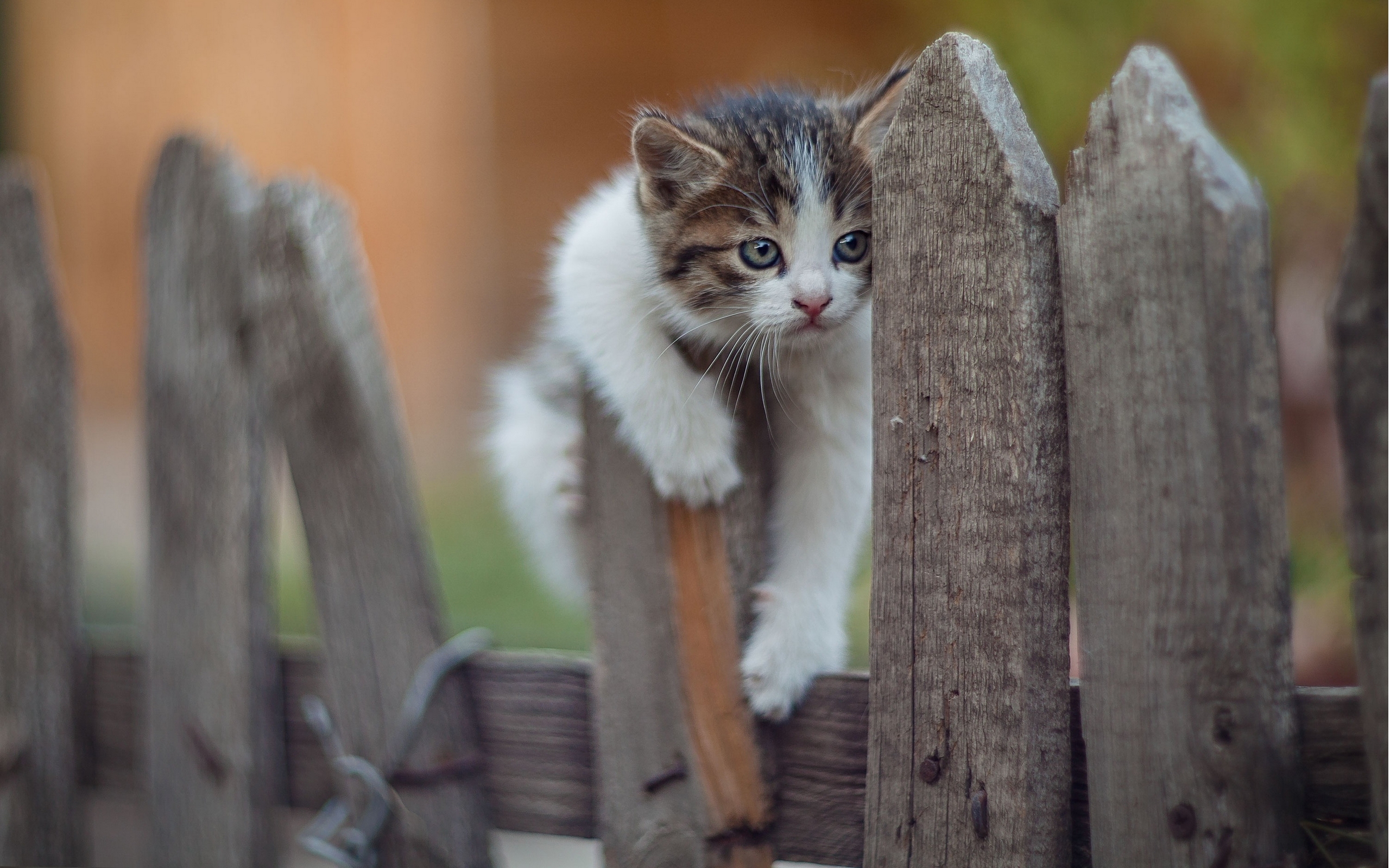 Description: A kitten is climbing over a wooden fence and looking at the camera with a curious look on its face.