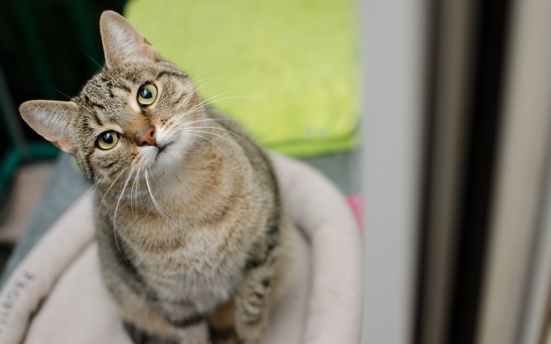 Description: A cat sitting on a cat bed looking up at the camera with a curious look on its face and eyes.