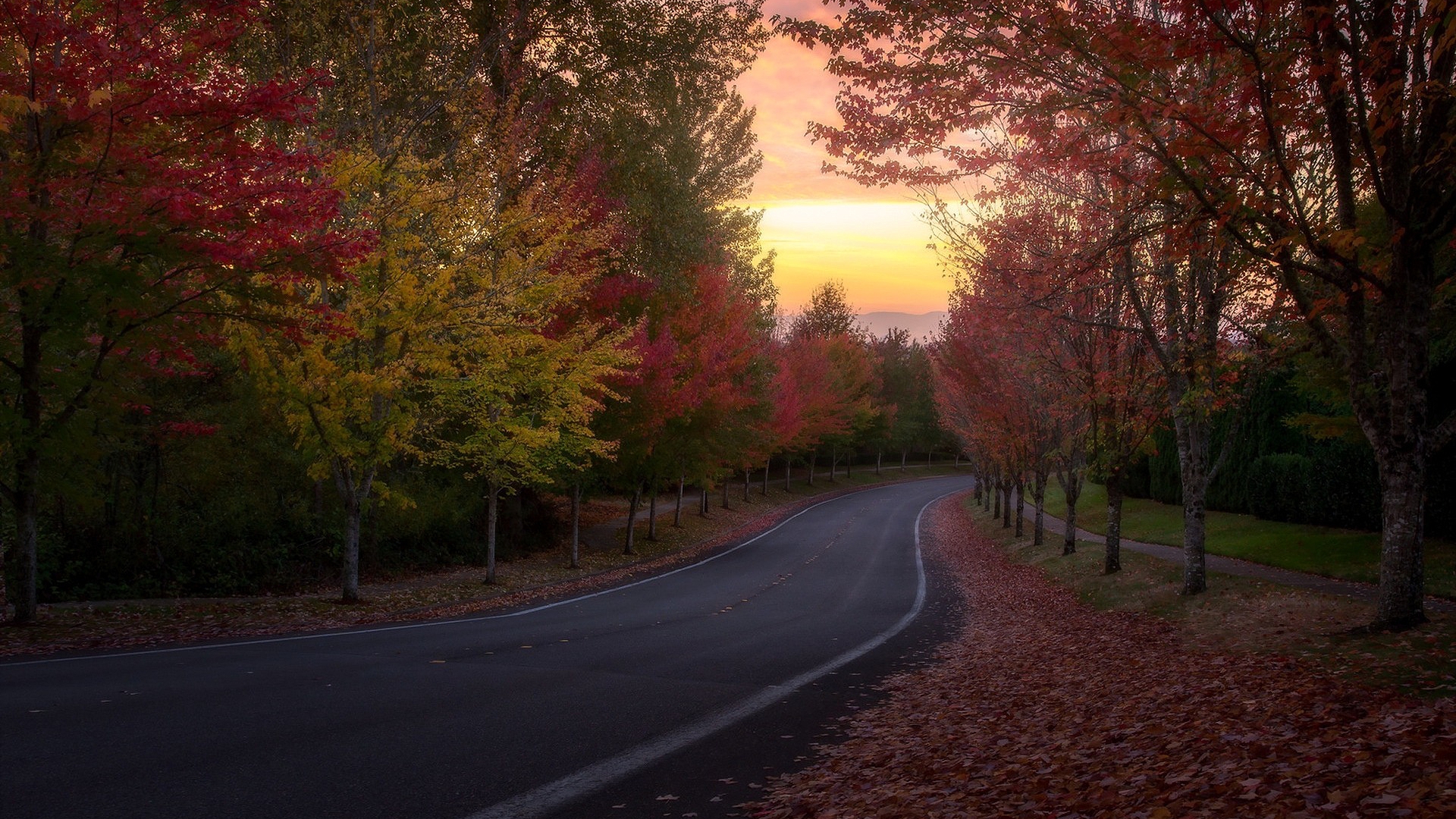 Description: A road with a curve in the middle surrounded by trees with red leaves on it and a sunset in the background.