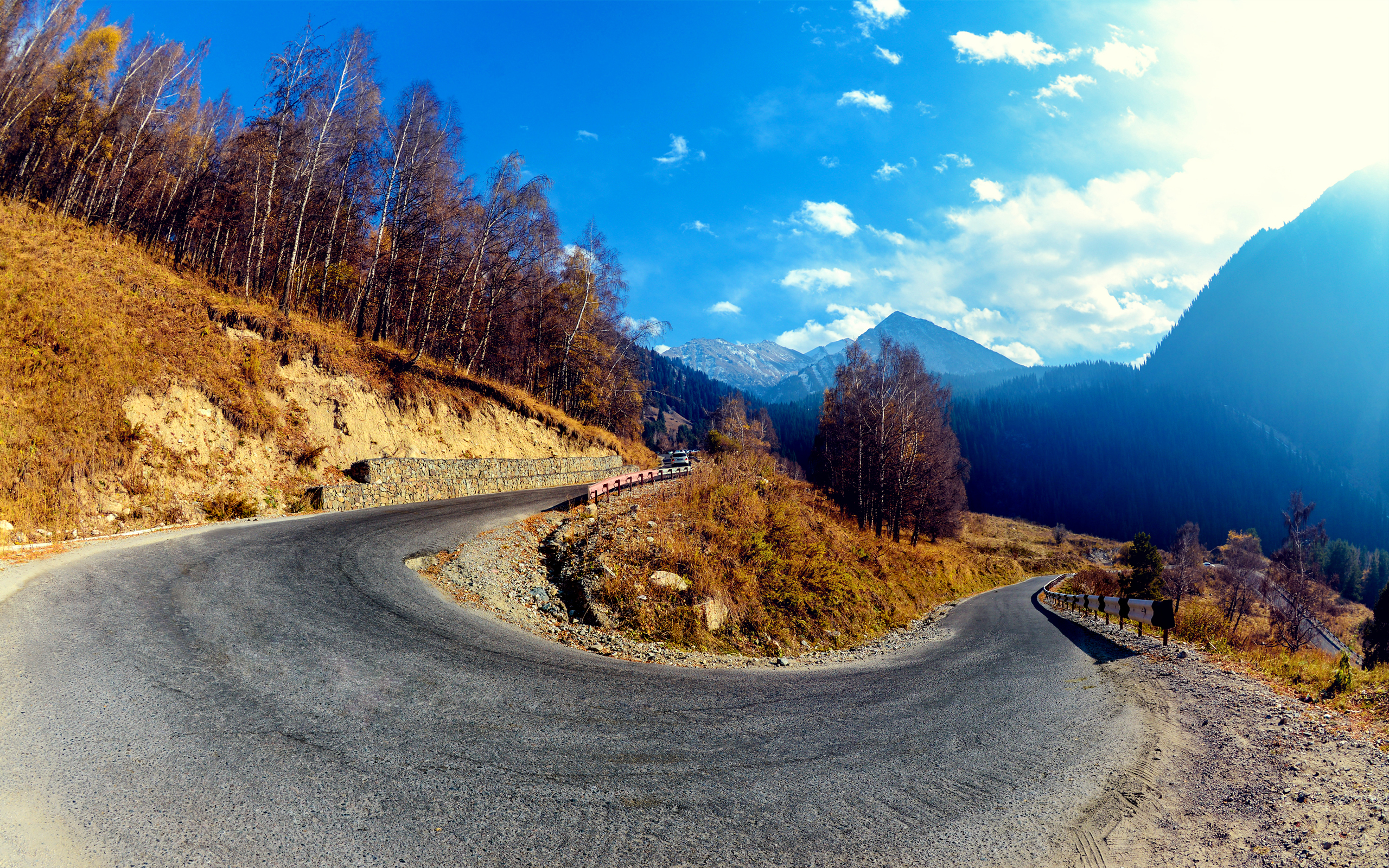 Description: A curved road with a train on the side of it and mountains in the background with a blue sky.