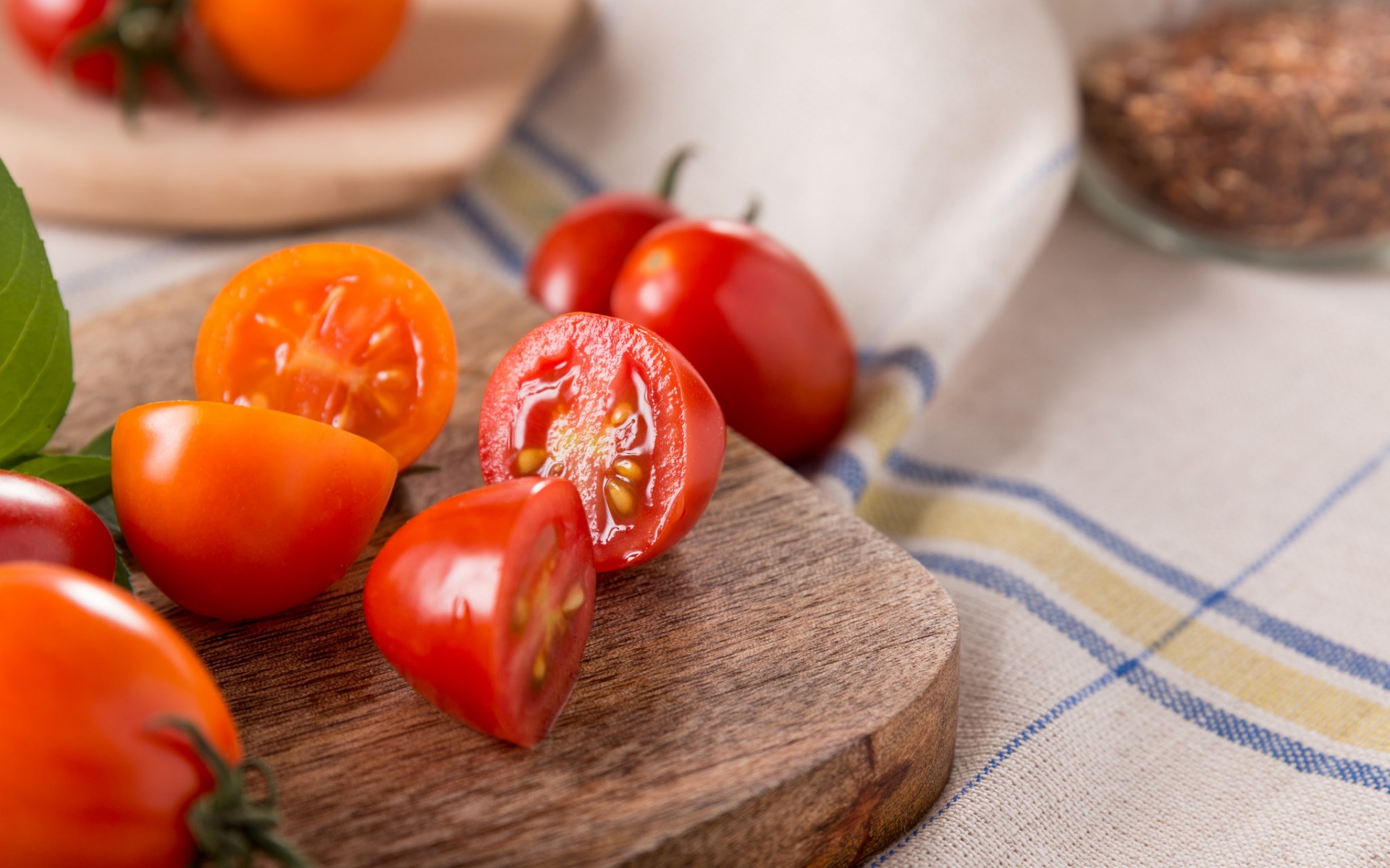Description: A cutting board with tomatoes and a knife on it next to a bowl of seeds and a spoon of seeds.