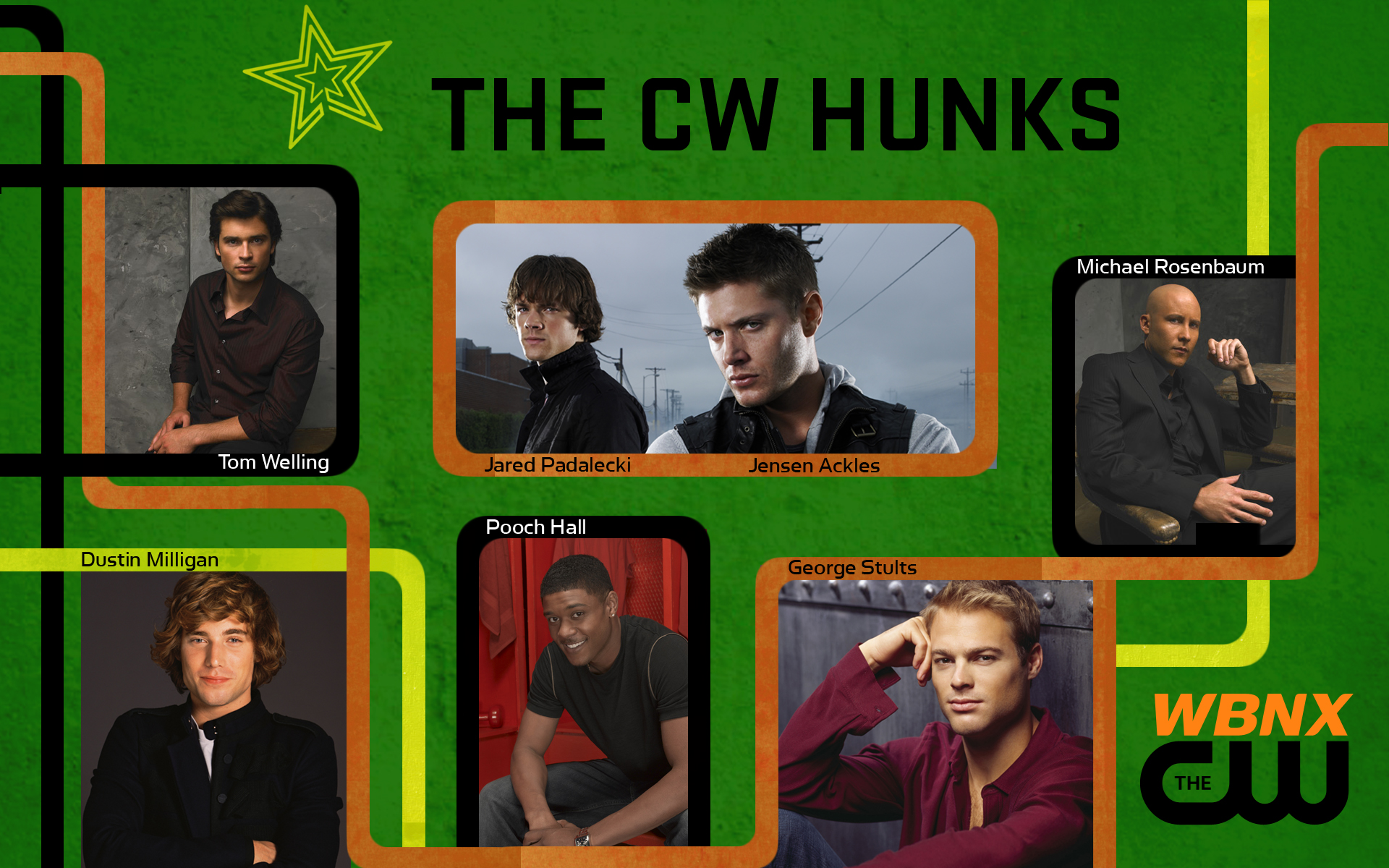 Description: A group of men sitting next to each other on a green background with the words the cw hunks.
