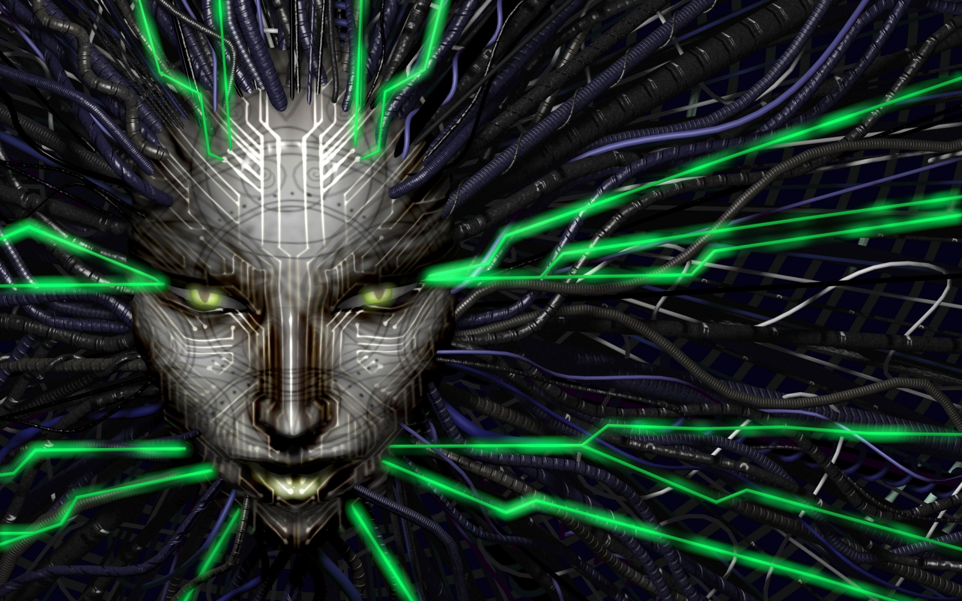 Description: A digital image of a cat with green eyes and a black background with green lines and a white face.