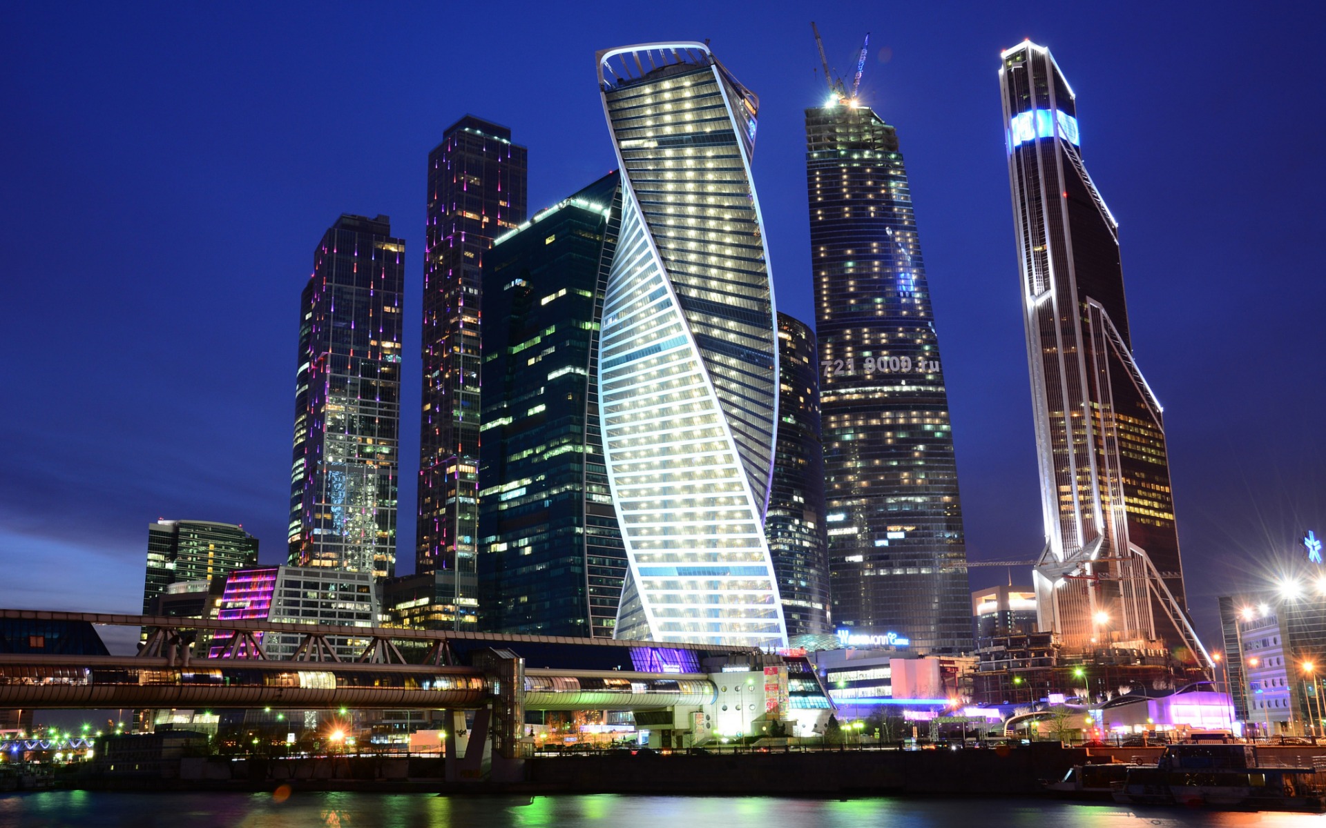 Description: A city skyline with a bridge and a river in front of it at night time with lights on and a bridge in the foreground.
