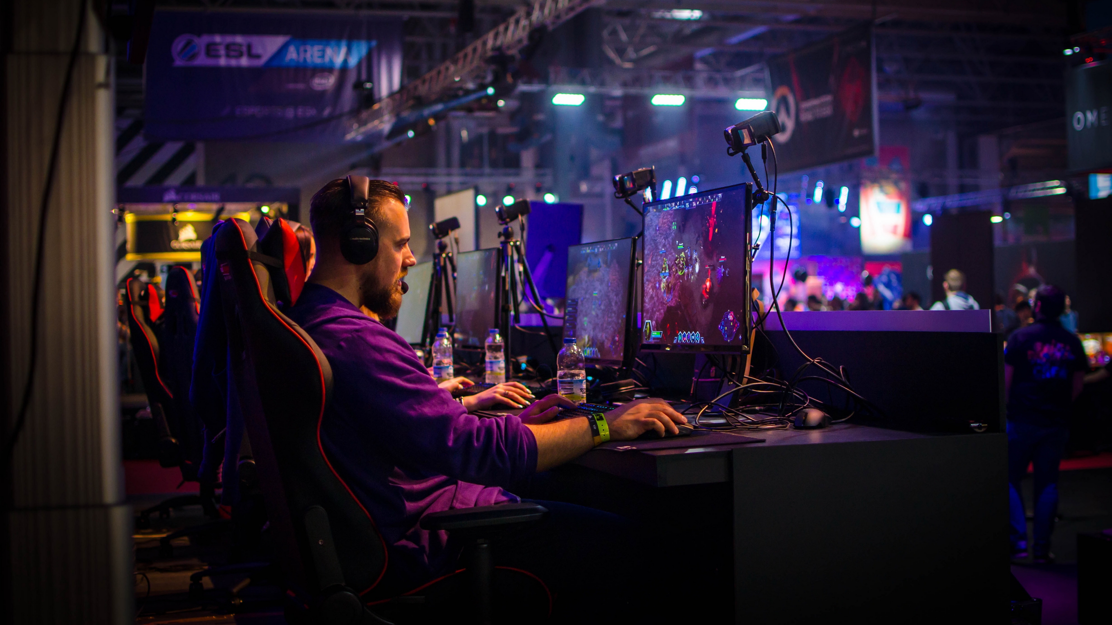 Description: A man sitting at a computer desk with headphones on his ears and a microphone in his hand.