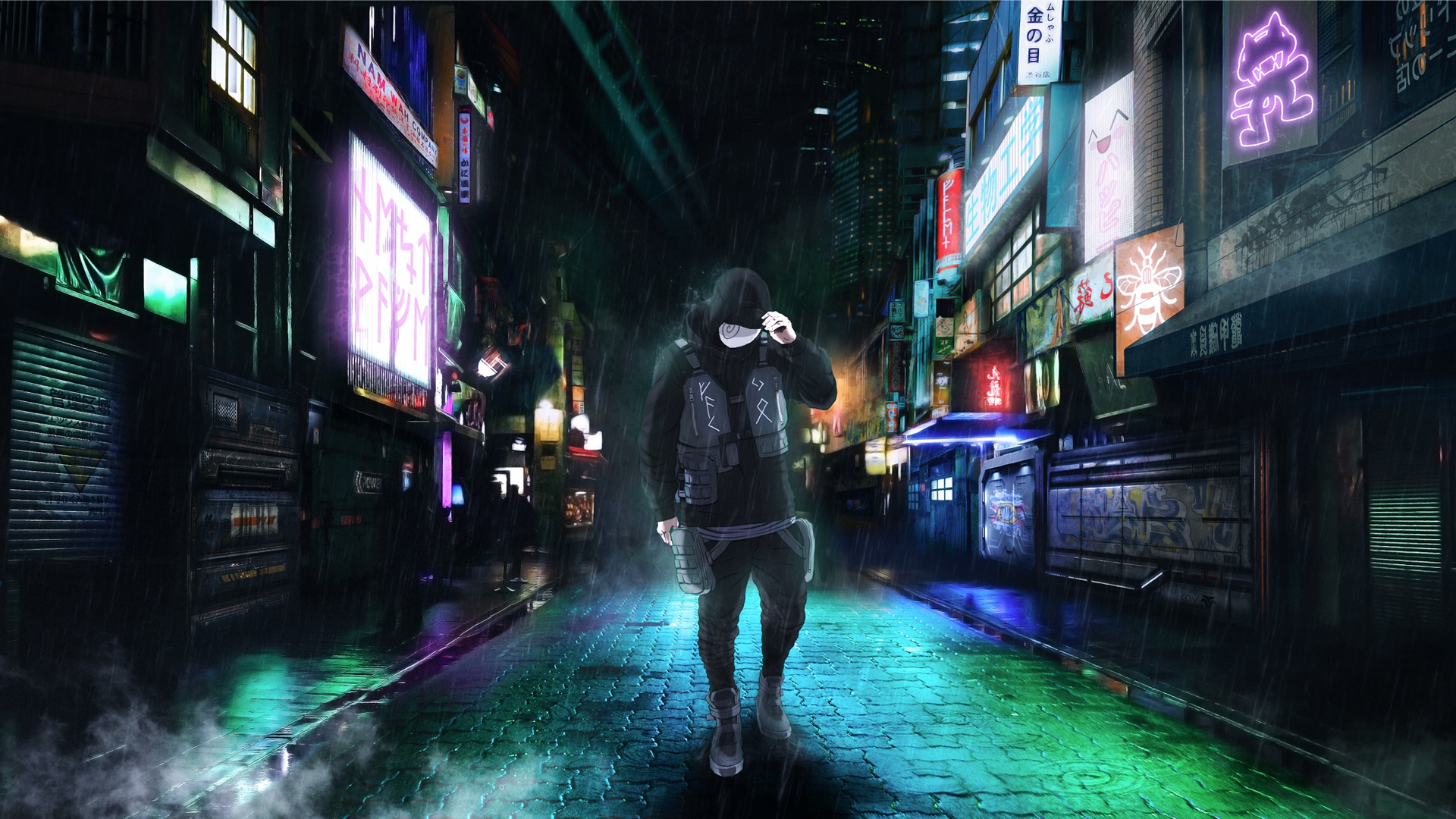Description: A person walking down a street in the dark with neon lights on the buildings and signs on the buildings.