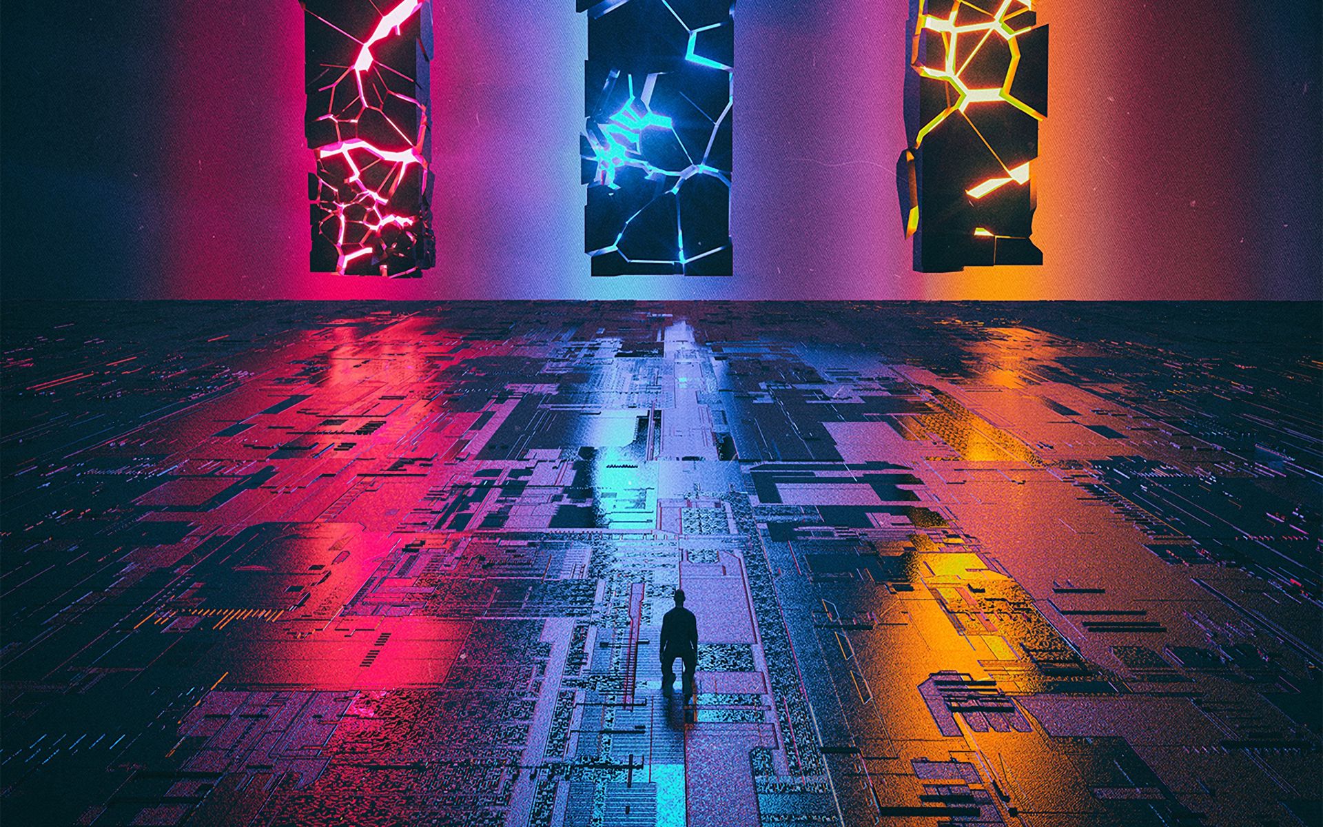 Description: A man walking through a room with a lot of lights on it's walls and a floor covered in electronic circuit boards.