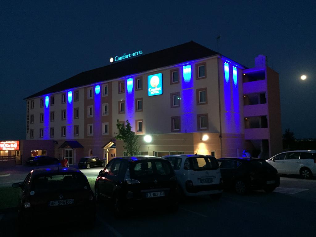 Description: A hotel with a blue light on the front of it at night time with cars parked in front of it.