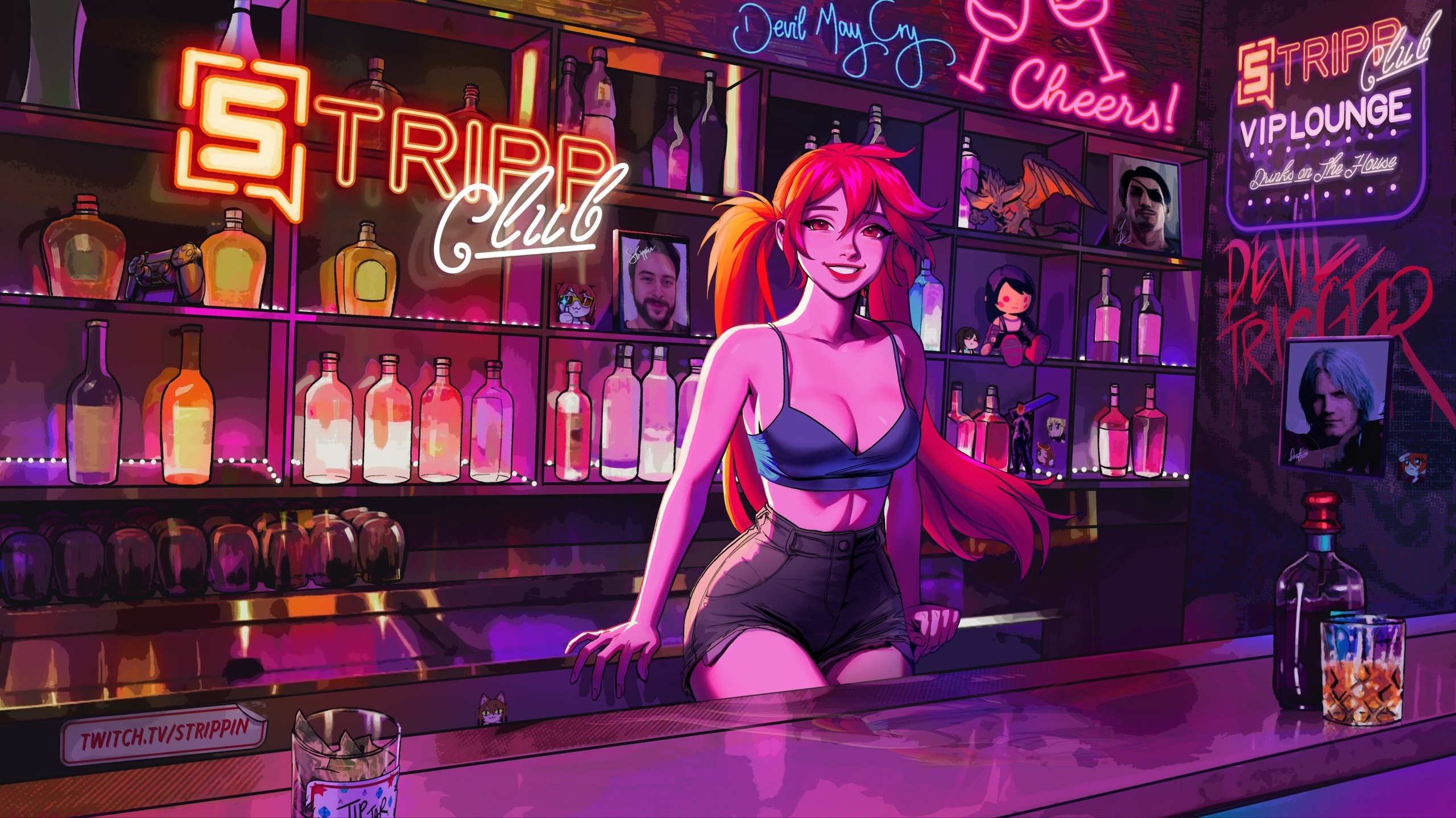Description: A woman in a bikini sitting at a bar with a bottle of booze in front of her and a neon sign behind her.