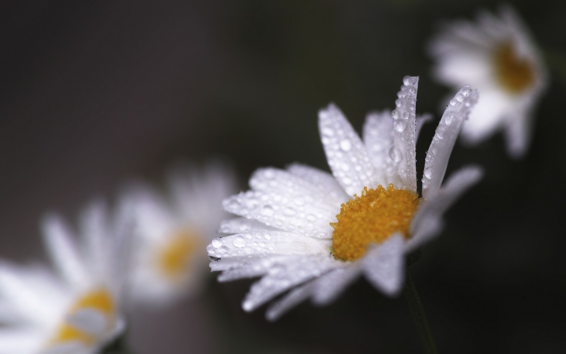 Description: A close up of a daisy with water droplets on it's petals and a black background with a yellow center.