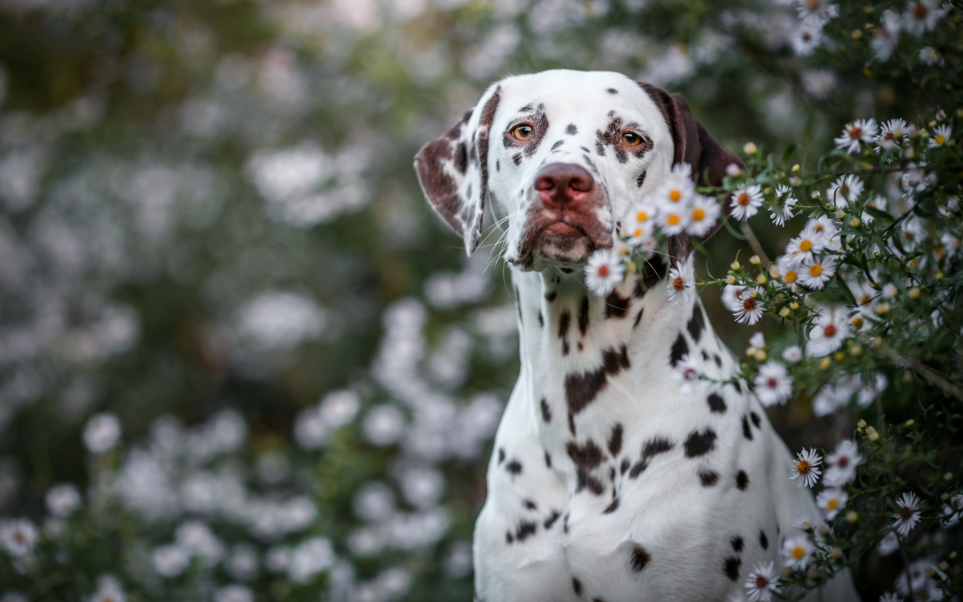 Description: A dalmatian dog is standing in a field of daisies and daisies in the foreground.
