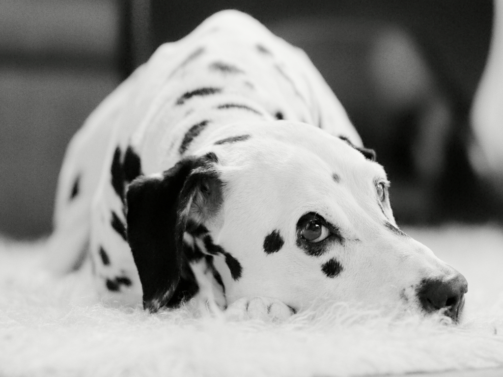 Description: A dalmatian dog laying on a white rug looking at the camera with a sad look on its face.