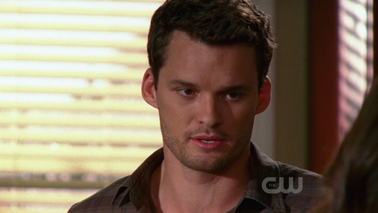 Description: A man in a plaid shirt looking at a woman in a dress shirt and a window with blinds behind him.
