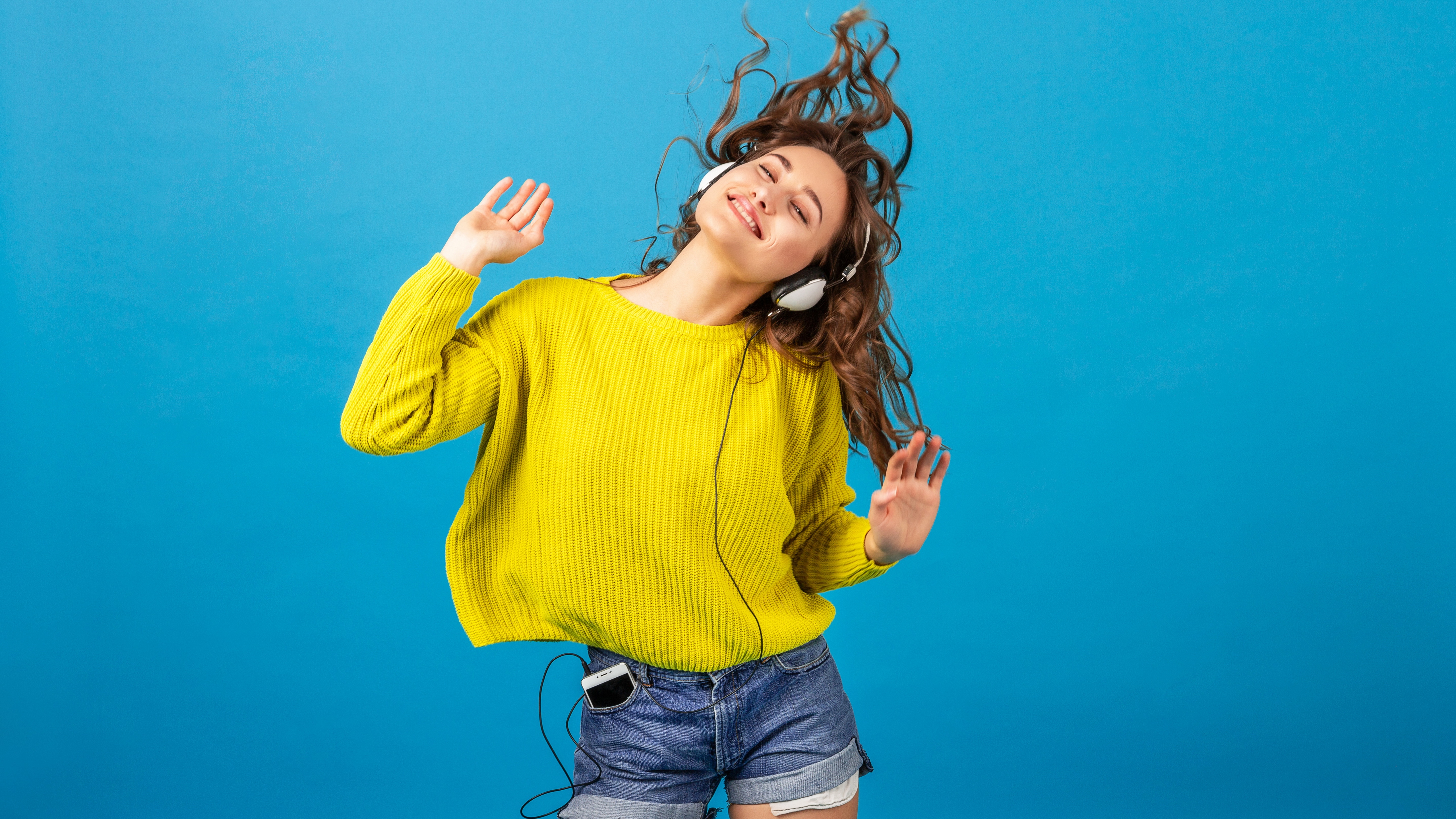 Description: A woman with headphones on her ears is dancing in the air with her hair in the air and her eyes closed.