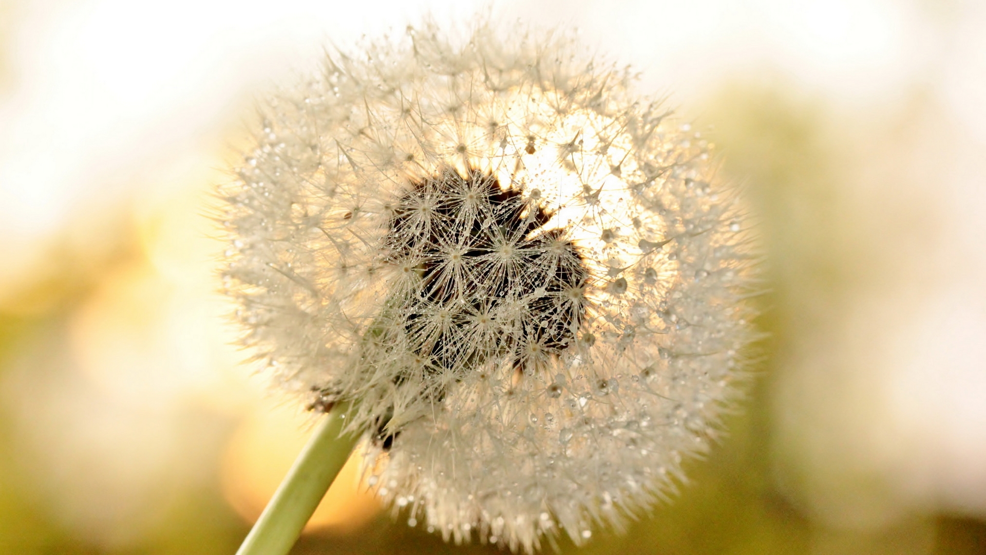 Description: A dandelion with a blurry background of grass and sunlight in the background is a blurry image.