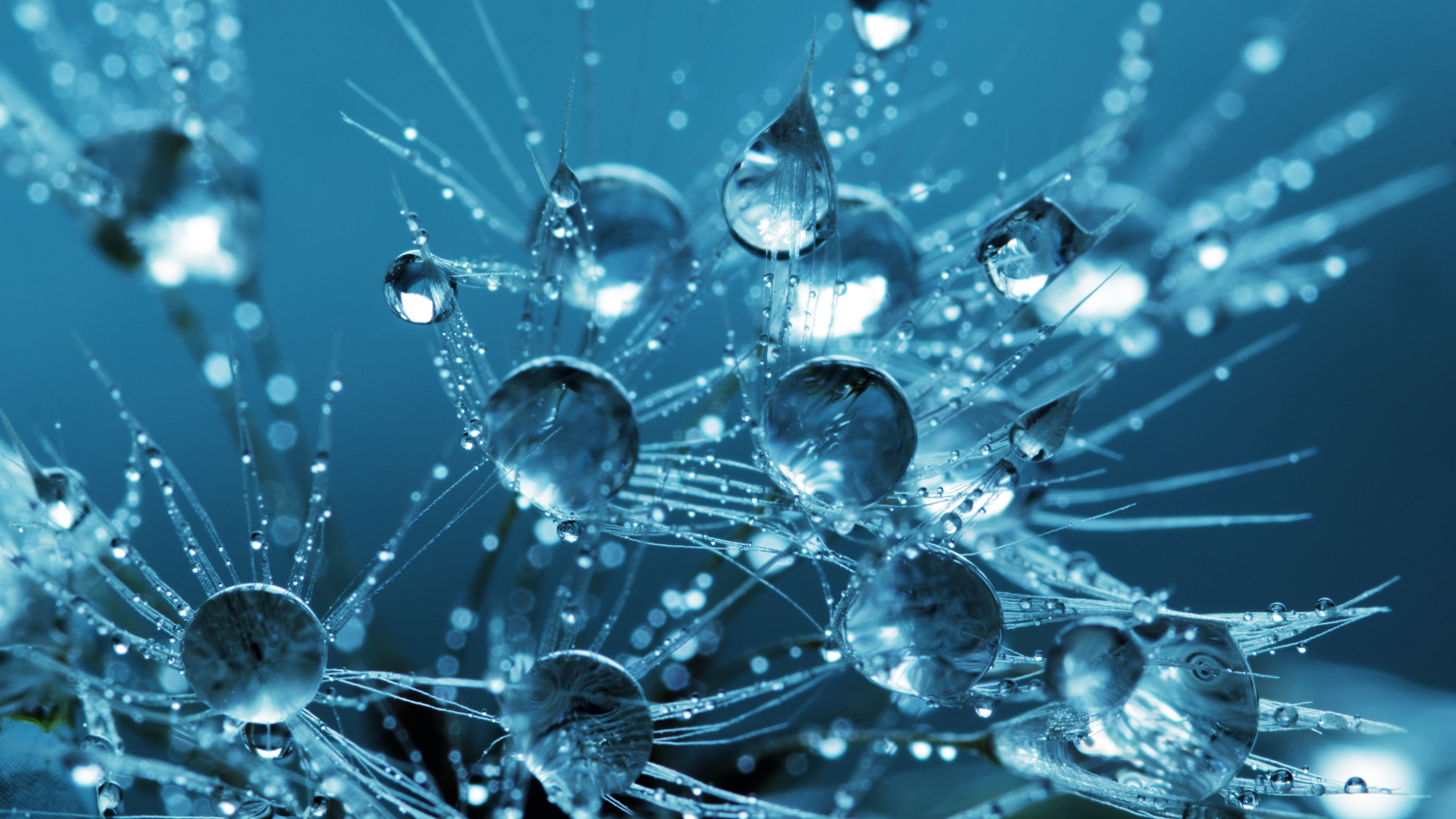 Description: A close up of a dandelion with water droplets on it's petals and leaves in the foreground.