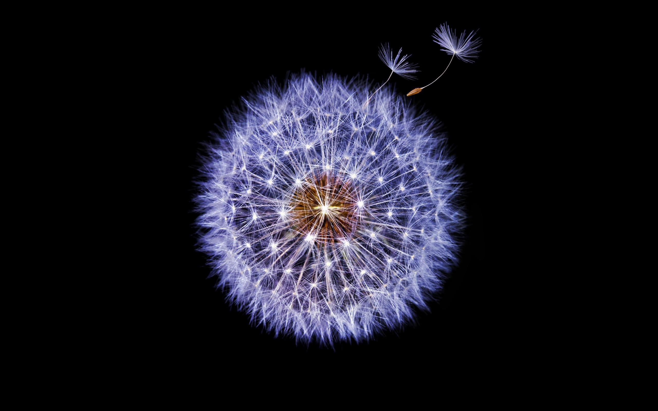 Description: A dandelion with a black background and a small yellow dandelion flying in the air with a black background.