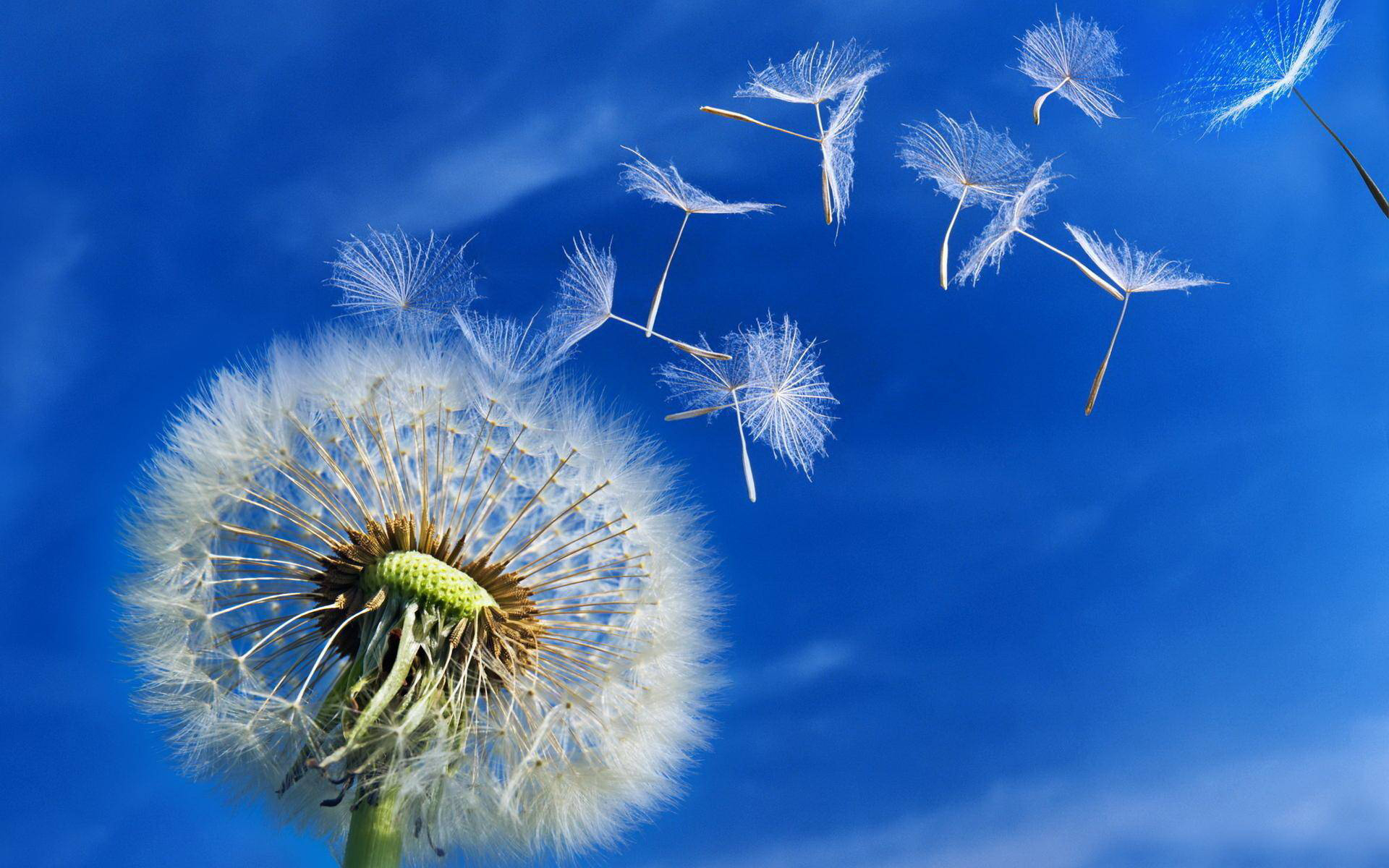 Description: A dandelion blowing in the wind with a blue sky in the background and a few clouds in the sky.
