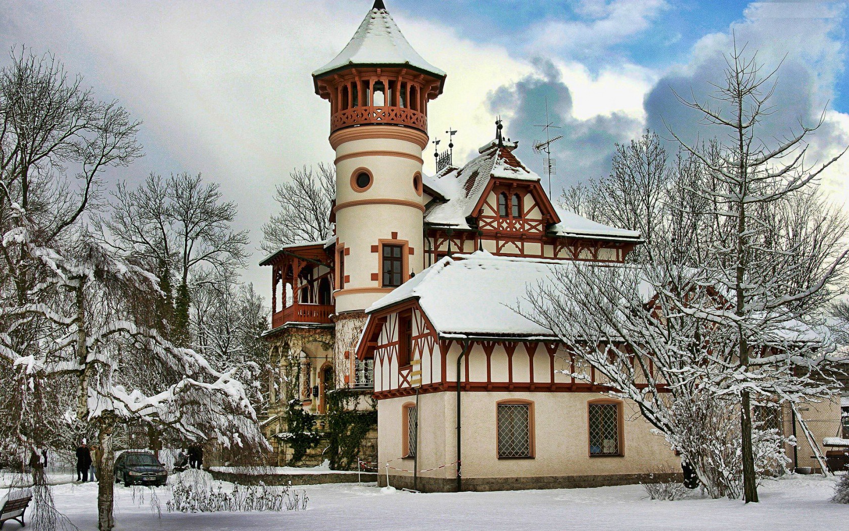 Description: A large building with a tower and a clock on it's side in the snow with trees and a car parked in front of it.