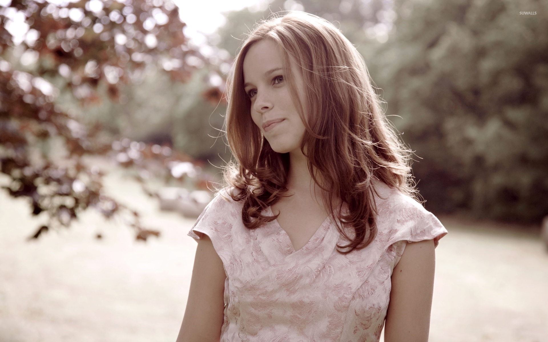 Description: A woman in a dress standing in a field of grass and trees with her eyes closed and her hair in the wind.