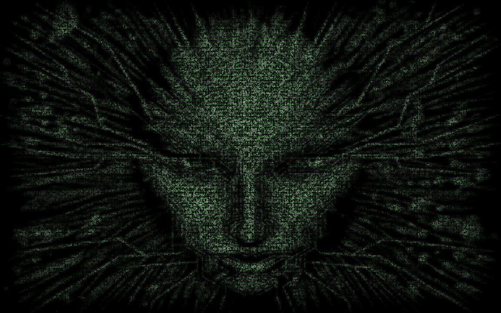Description: A dark background with a face made of words and numbers in the shape of a human head and eyes.