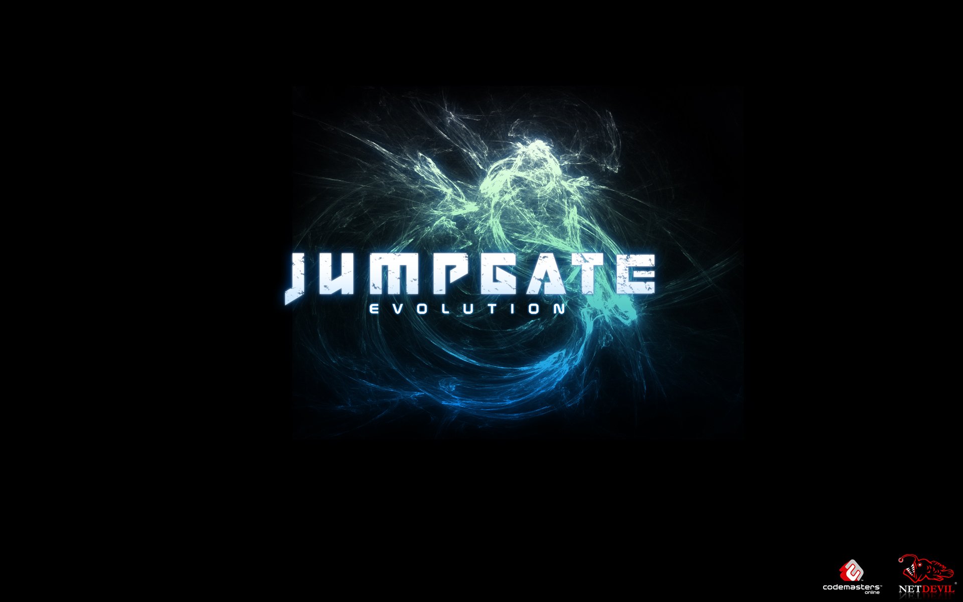 Description: A dark background with the words jumpgate evolution in the center of it and a blue swirl in the middle.