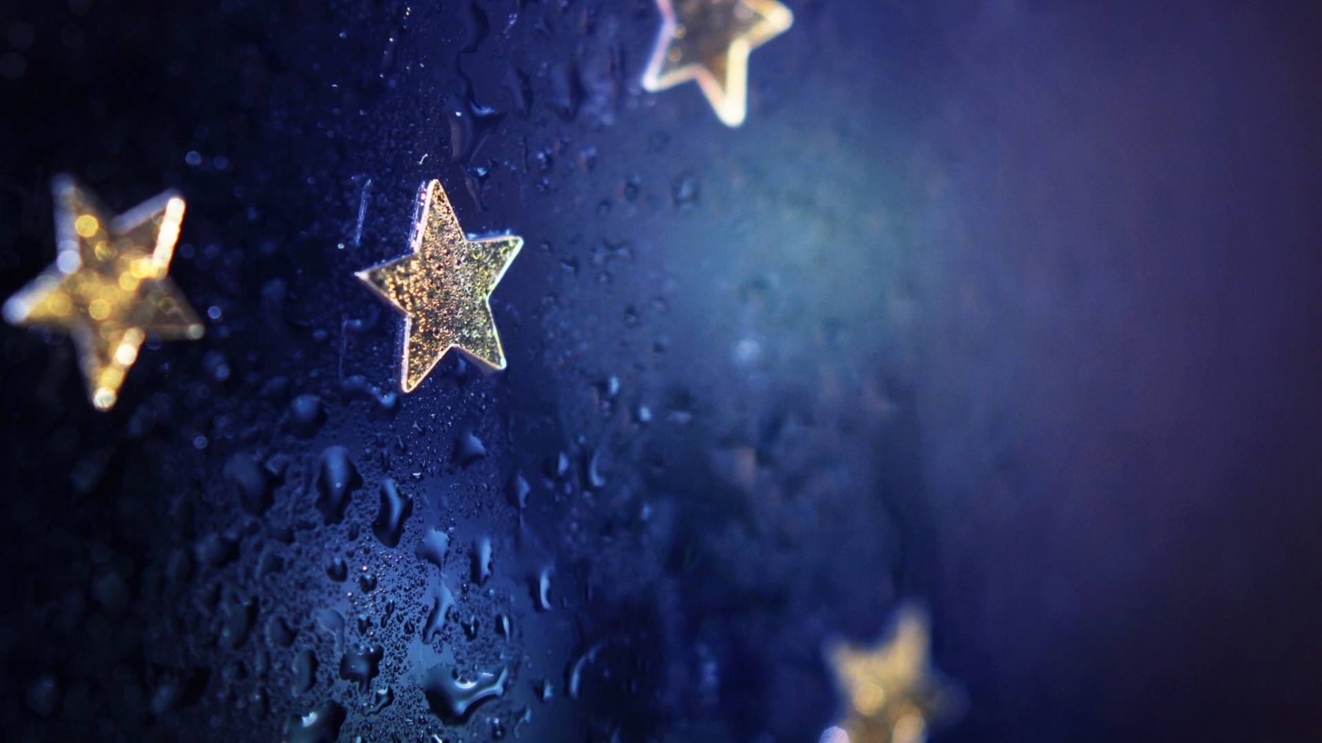 Description: A window with stars on it and rain drops on the glass and the window is dark blue and has a few yellow stars on it.