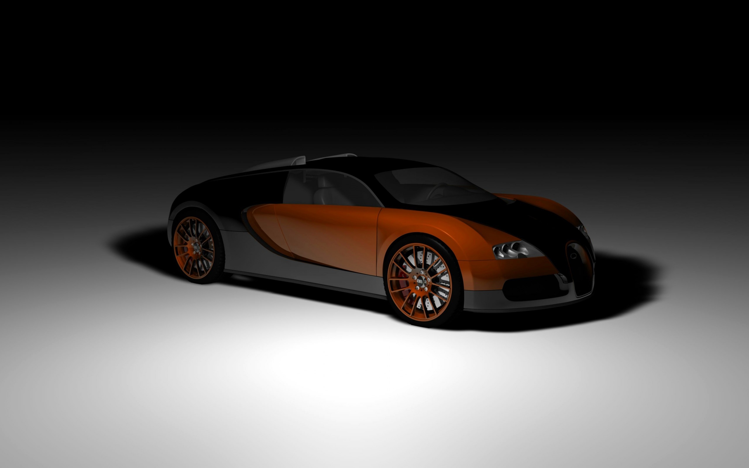 Description: A car is shown in a dark room with a light on it's side and a shadow on the floor.