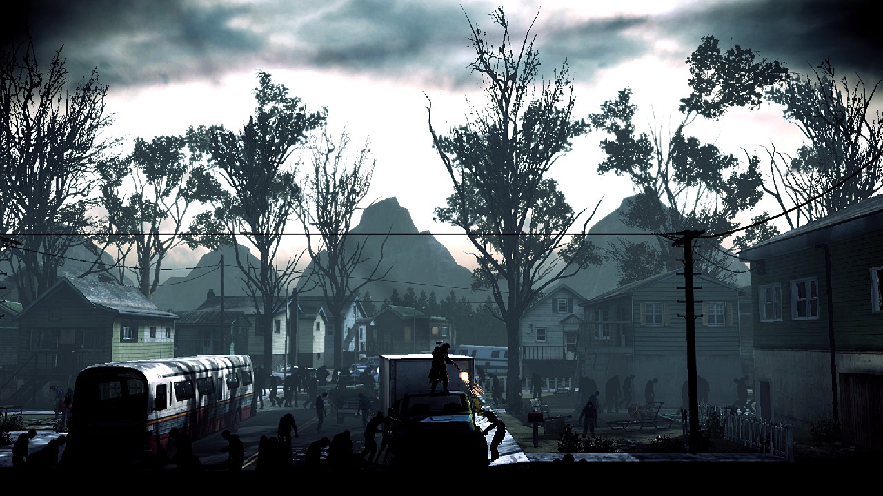 Description: A dark picture of a city with a cloudy sky above it and a person standing on a fence looking at the sky.