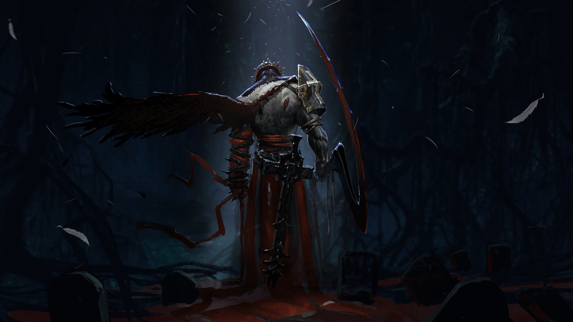 Description: A man with a sword and a bird on his arm in a dark forest with a light shining on him.