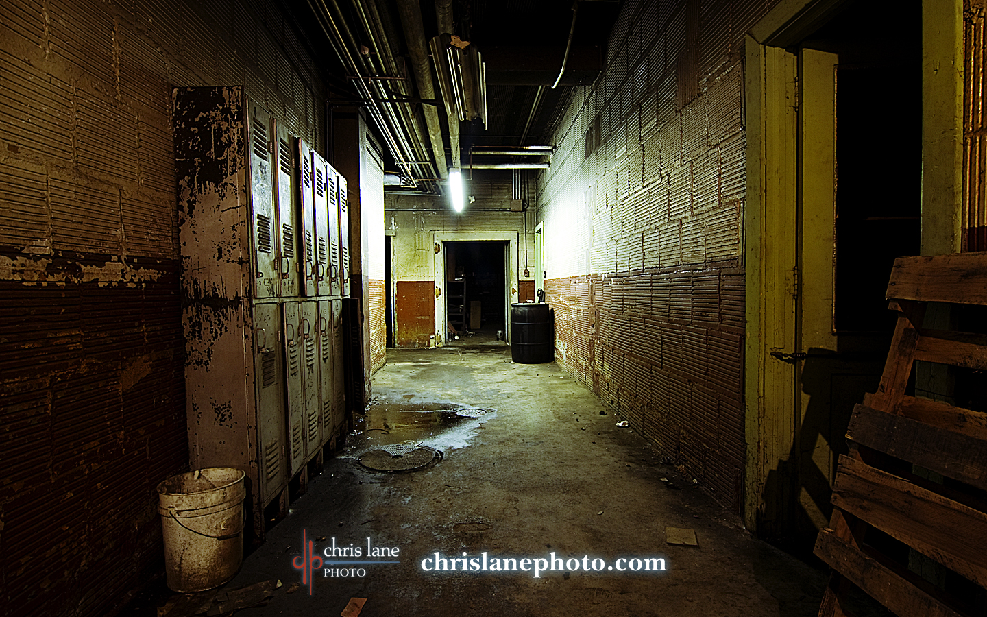 Description: A dark hallway with a bench and trash can in it and a trash can in the corner of the hallway.