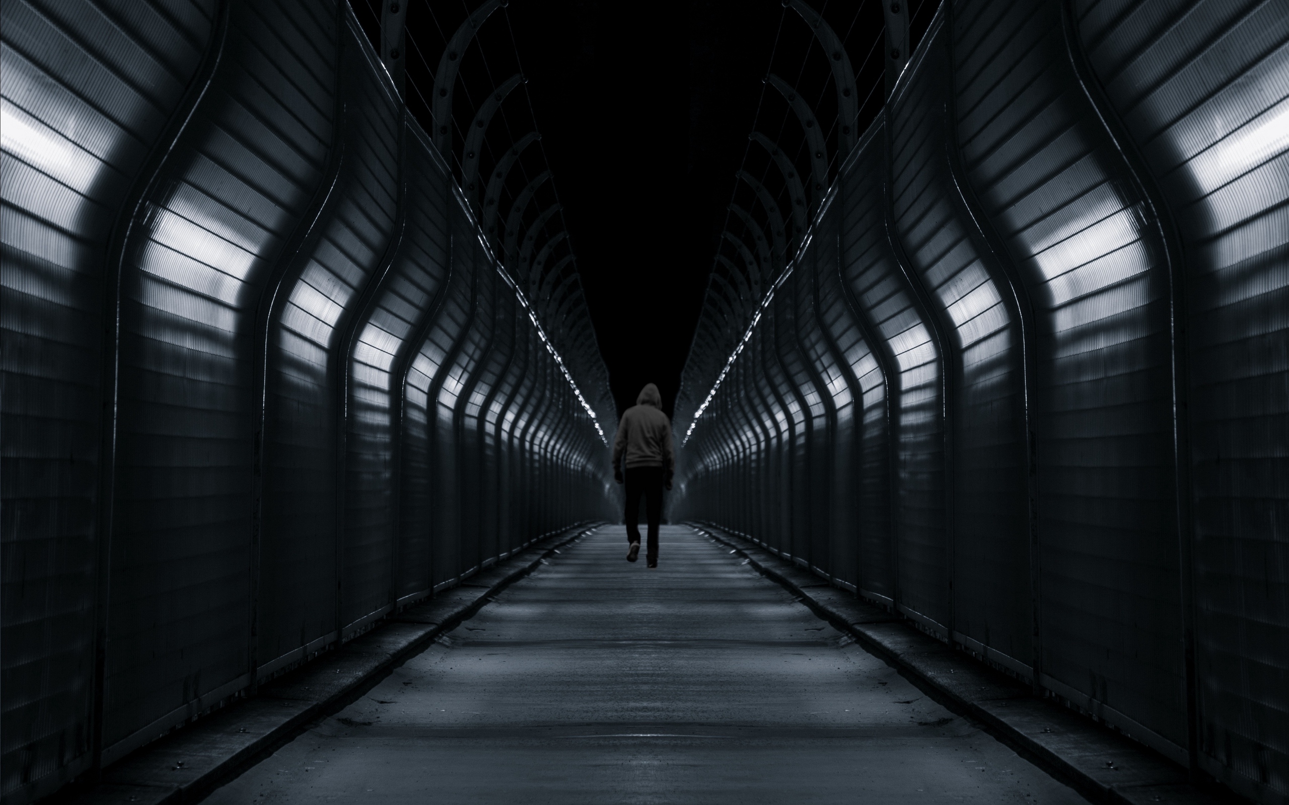 Description: A person walking down a long hallway in the dark with lights on the sides of the walkways and the floor.