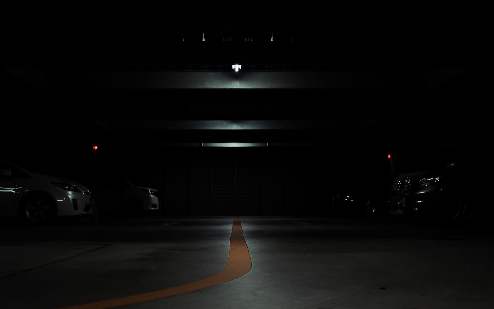 Description: A dark parking garage with a line of cars parked in it at night time.