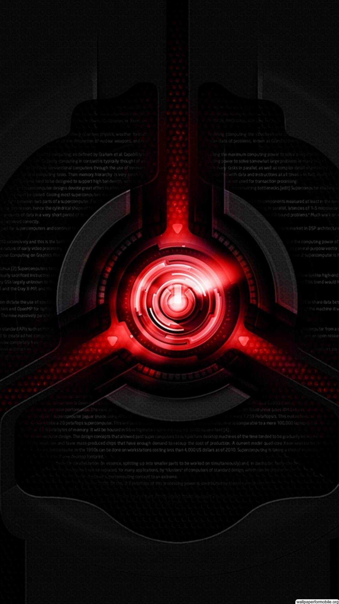 Description: A dark background with a red light in the center of it and a circular design on the bottom of the image.