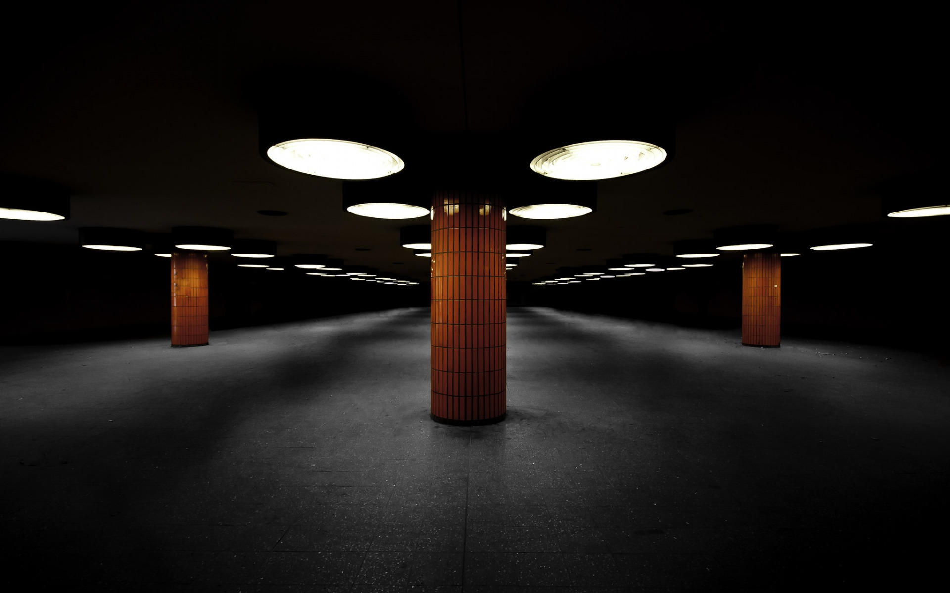 Description: A dark room with three round lights and a column in the middle of the room with a black floor.