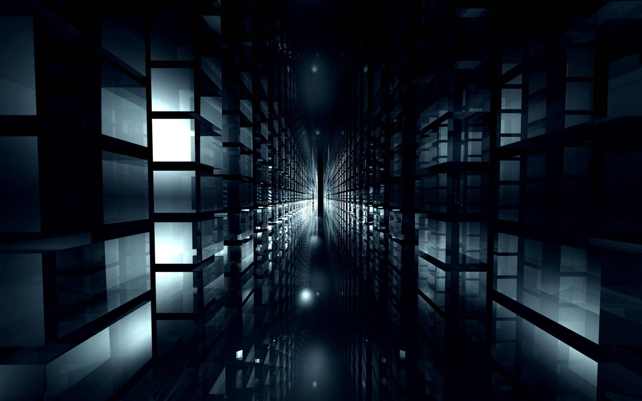 Description: A dark room with a lot of shelves and lights on the wall and floor and a long hallway with a light at the end.