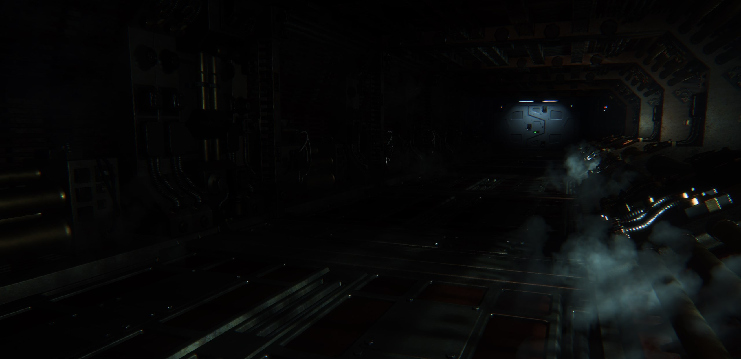 Description: A dark room with steam coming out of the floor and a clock on the wall in the center of the room.