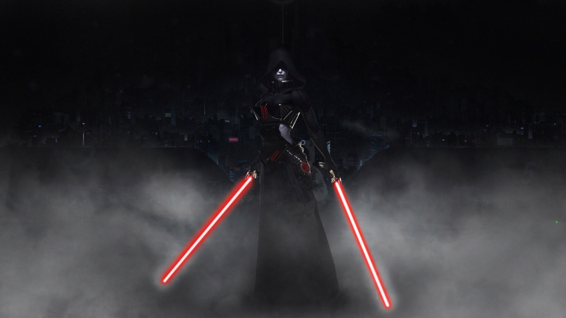 Description: A person in a dark costume holding two lightsabes in the dark with fog behind them and a dark background.