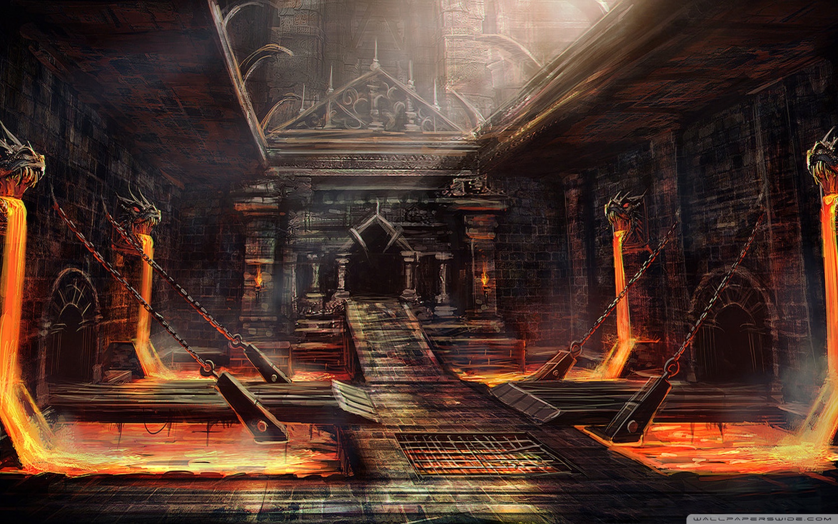 Description: A painting of a dark and scary hallway with fire coming out of the walls and a staircase leading to a second floor.