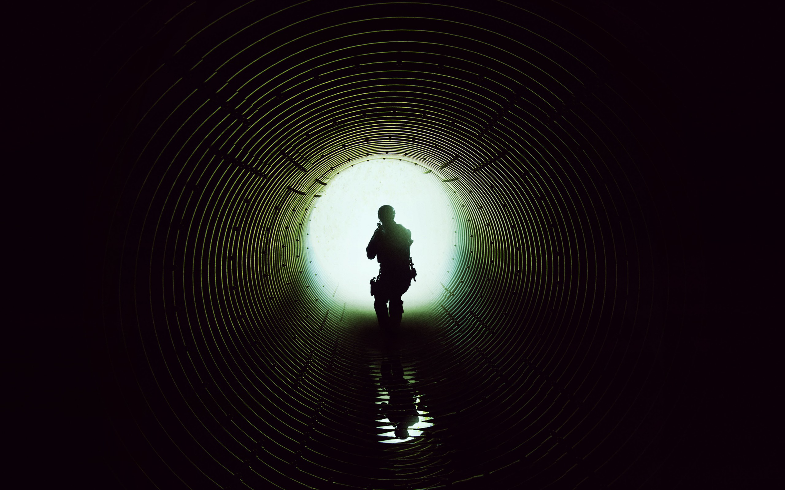 Description: A person standing in a dark tunnel with a light at the end of it and a light at the end of the tunnel.