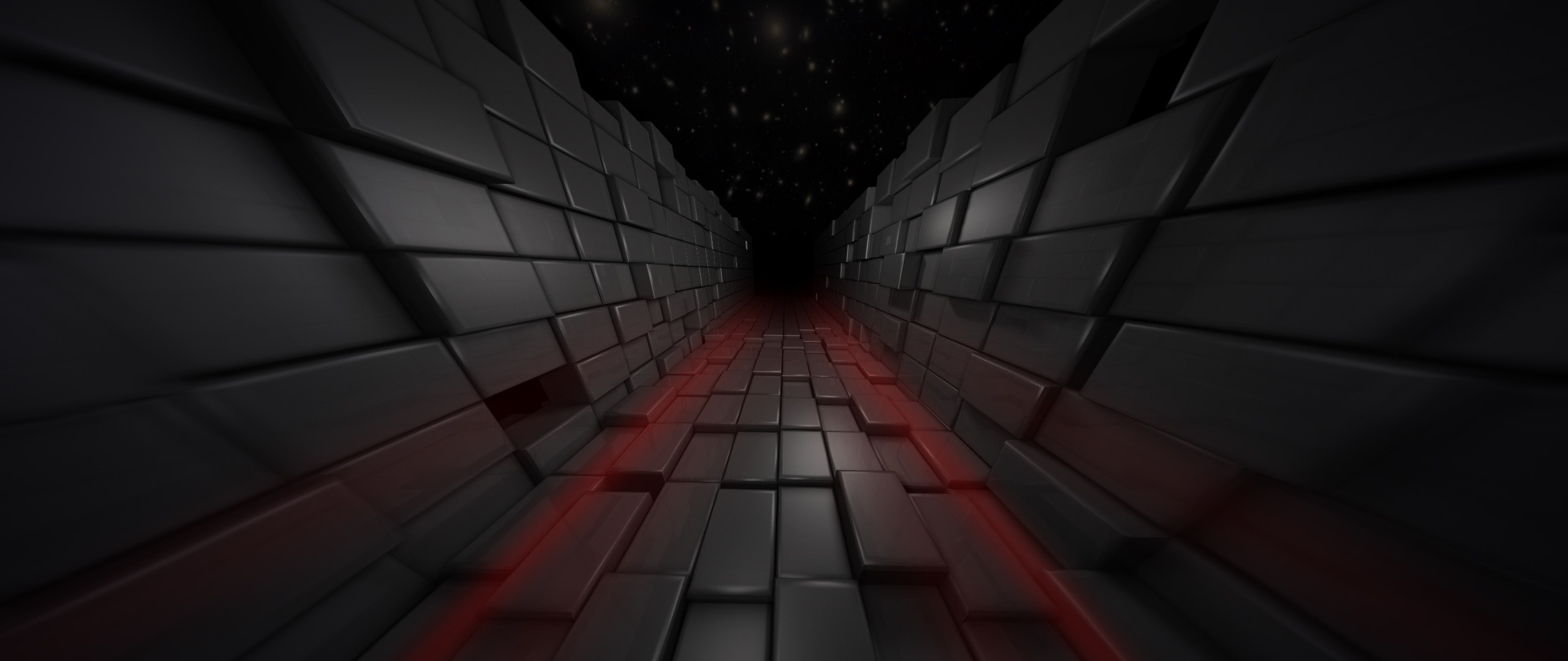 Description: A dark tunnel with red lights and a red light at the end of the tunnel is a dark room with a red light at the end.